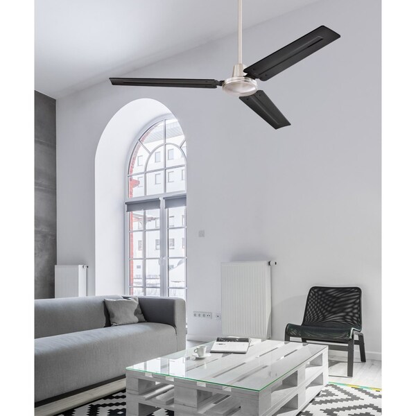 The modern-industrial style of the 56 in. Jax ceiling fan is perfect for lofts and great rooms, featuring a 12 inch long down rod ideal for higher ceilings. The brushed nickel ceiling fan with black blades adds dramatic appeal to contemporary spaces, enhancing the comfort of any room.