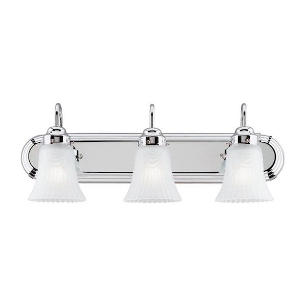 A sleek chrome finish and bright multi-light design characterize this Westinghouse Three-Light Interior Wall Fixture. The subtly textured frosted pleated glass extends on curved arms from a long oval back plate, which features a tiered edge. Install the fixture up or down depending on your needs. No matter where or how you place it, you will be satisfied with the bright light and transitional style this fixture adds to your space. The fixture is 8-1/2 by 24 inches (H x W) and extends 7-1/4 inches from the wall. It uses three medium-base light bulbs, 100-watt maximum (not included). It is backed by a five-year limited manufacturer's warranty against defects in materials and workmanship; it is ETL/CETL listed for safety. Product reference number 66522.