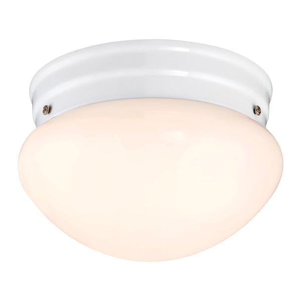 This transitional Westinghouse One-Light Flush-Mount Interior Ceiling Fixture adeptly combines a traditional mushroom glass shape with a contemporary, clean tone. The simple white finish matches the white glass, which provides even, diffuse light with the benefits of energy-efficient LED technology. The fixture hugs the ceiling closely, making it suited to lower ceilings as well as high ones. It is 4-3/8 inches high by 7-1/4 inches in diameter. The fixture is backed by a five-year limited manufacturer's warranty against defects in materials and workmanship.