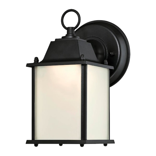 This Westinghouse One-Light Exterior Wall Lantern features a handsome textured black finish and frosted glass panels. The clean lines and simple shape offer a traditional look that goes well with most architectural styles. The lantern mounts securely to any exterior wall and is ideal for entryways, porches, and decks. The lantern is 8-1/5 by 4-1/2 inches (H x W). No bulbs to replace, this fixture includes integrated LEDs. The fixture is ETL/CETL kisted for safety and is backed by a five-year limited warranty.