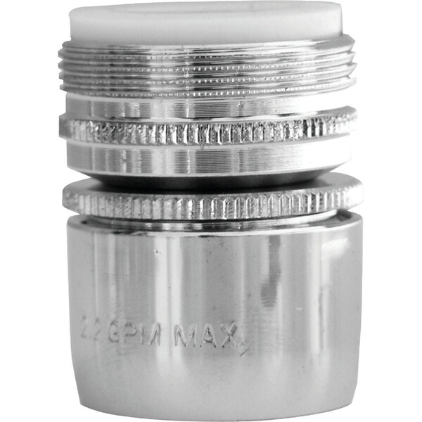 Dual thread chrome plated brass swivel aerator. California flow rate compliant product for kitchen faucets 55/64 x 27 Female x 15/16 Male 1.5 GPM (gallons per minute) at 60 psi (pounds per square inch).