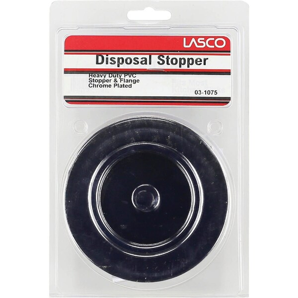 Heavy-duty PVC body universal disposal stopper and flange. To install remover old stopper push flange into disposal opening.