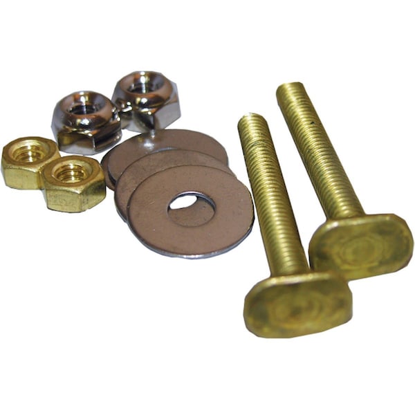 Includes 2 each 1/4 x 2-1/4 brass bolts with stainless steel washers 1/4 acorn nuts and brass hex nuts. Secures toilet bowl to floor flange. Fit most toilets.