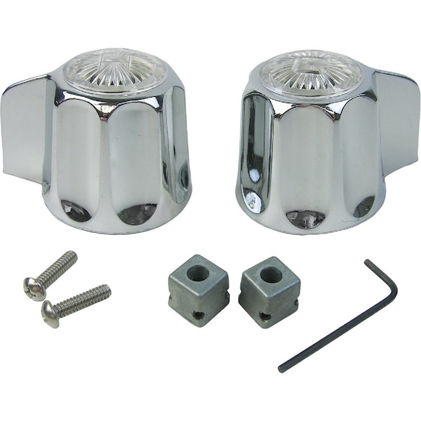Small universal chrome canopy hot and cold faucet handles with set screw adapters.
