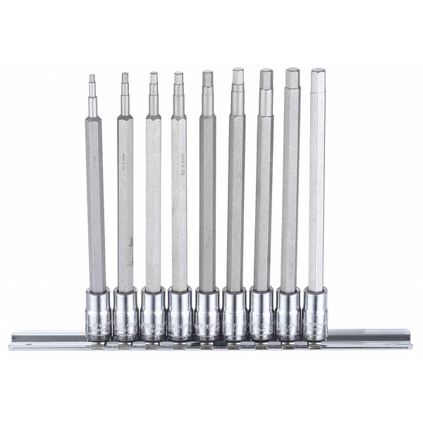Socket Bit Set, Tip Size 2 mm, 2.5 mm, 3 mm, 3.5 mm, 4 mm, 4.5 mm, 5 mm, 5.5 mm, 6 mm, Tip Style Hex, Overall Length 4 51/64 in, Drive Size 1/4 in, Number of Pieces 9, Alloy Steel, Chrome, Metric, Insulated No, For Screw Type Hex