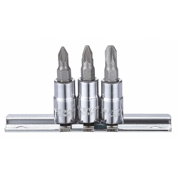 Socket Bit Set, Tip Size #1, #2, #3, Tip Style Pozidriv, Overall Length 1 9/16 in, Drive Size 1/4 in, Number of Pieces 8, Alloy Steel, Chrome, SAE, Insulated No, For Screw Type Pozidriv