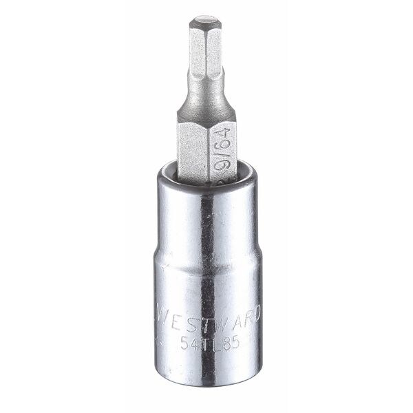 The WESTWARD - 54TL85 Bit Socket is a standard socket bit with an overall length of 1 1/2 inches and an insert length of 5/8 inch. It features a hex tip style, designed for use with hex screw types. The drive size measures at 1/4 inch while the tip size is precisely set at 9/64 inch. This SAE measurement type tool falls under the category type of socket bits and has six points, making it suitable for various general applications.