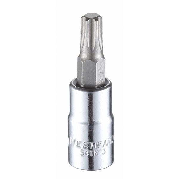 Crafted from durable alloy steel, the WESTWARD - 54TN13 Bit Socket ensures longevity and resistance to wear and tear. Its chrome finish not only enhances its aesthetic appeal but also provides additional protection against corrosion. The bit style is Torx(R), which aligns with the six-point measurement type characteristic of this design.