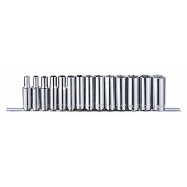 Socket Set, Standard Socket Count/Style None, Deep Socket Count/Style (14) 6-Point, Deep Socket Style/Size Deep 6-Point: 10 mm, 11 mm, 12 mm, 13 mm, 14 mm, 15 mm, 16 mm, 17 mm, 18 mm, 19 mm, 6 mm, 7 mm, 8 mm, 9 mm, Flex Socket Count/Style None, Hand, Drive Size 3/8 in, Metric, 6-Point, Chrome