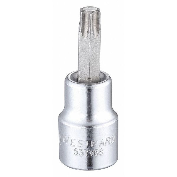 The WESTWARD - 53YV89 Bit Socket is a standard socket bit designed for Torx screws. With an insert length of 7/8 in and an overall length of 1 7/8 in, this tool provides adequate reach for various tasks. The drive size is set at 3/8 in, suitable for many common applications. This socket bit features a T40 tip size and adheres to the Torx(R) measurement type with six points, making it compatible with corresponding screw types.