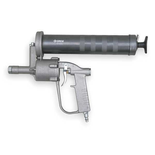 Pneumatic Grease Gun, Grease Gun Loading Method Bulk, Cartridge, Suction, Grease Gun Handle Style Pistol Grip, Nozzle Extension Type Flex Hose, Strokes per Oz. 40, Max. Operating Pressure 5,000 psi, Air Inlet Size 1/4 in FNPT, Air Input Range 40 to 120 psi, Cartridge Capacity 14 1/2 oz, Bulk Capacity 16 oz, Hose Length 12 in, Tube Color Gray, Tube Material Steel, Pressure Ratio 50:1, Grease Type Up to and Including NLGI Grade 2 Greases, Tool Length 16 in