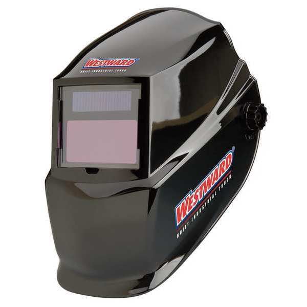 Welding Helmet, ADF Controls Analog, Battery Chemistry Lithium Ion, Battery Life 2,500 hr, Battery Type CR2330, Color Black, Compatible Suspension Brand Name Westward, Compatible Suspension Grainger Part Number 45M952, EN379 Classification 1/1/1/2, Grind Mode No, Helmet Material Nylon, Helmet Type Auto-Darkening, Helmet Width 23 cm, Includes Protective Front Cover Lens, Includes Batteries Yes, Lens Material LCD, Light State 3, Magnification No, Number of Arc Sensors 2, Power Source Solar