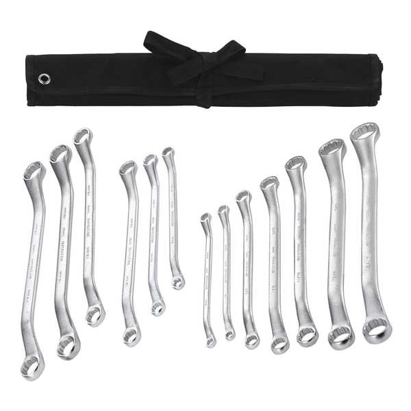 Box End Wrench Set, Alloy Steel, Satin, Insulated No, Number of Tools 13, 1/4 in to 1 in, 6 mm to 19 mm, 40 Degrees , Canvas Pouch, SAE/Metric, Offset, 12-Point Box End