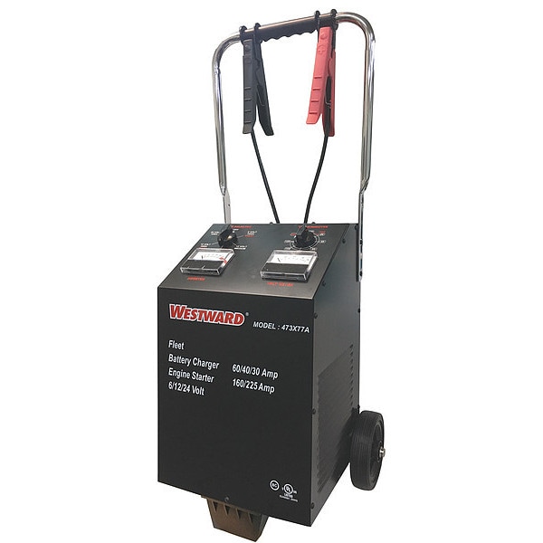 Battery Charger, Charger Style Wheeled, For Use With Battery Type AGM, Lead Acid, Automatic/Manual Automatic, For Battery Voltage 6 V DC, 12 V DC, 24 V DC, Boost Current @ Voltage 160 A @ 6V, 225 A @ 12V, Charging Current @ Voltage 30 A @ 24V, 60 A @ 12V, 60 A @ 6V, Maintaining Current @ Voltage 40 A @ 12V, 40 A @ 6V, Cable Length 6 ft, Cable Wire Gauge 6 AWG, Charge Type Auto On/Off, Charger Function Boosting, Charging, Maintaining, Cold Cranking Current @ Voltage 225 A @ 12V