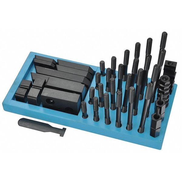 Clamping Kit, Machinist, Number of Pieces 52, Slot Size 14.00mm, For Use With Drilling Machines, Lathes, Milling Machines, Includes (6) Step Blocks, Material - Machining Steel, Application For Fixing Each Kind of Working Piece on Machining Table, Features All the Blocks, Bolts, Nuts and Hold-Downs are Case Hardened. Racks Can Be Bolted to the Wall or Side of Machine for Easy Access, Finish - Machining Black Oxide