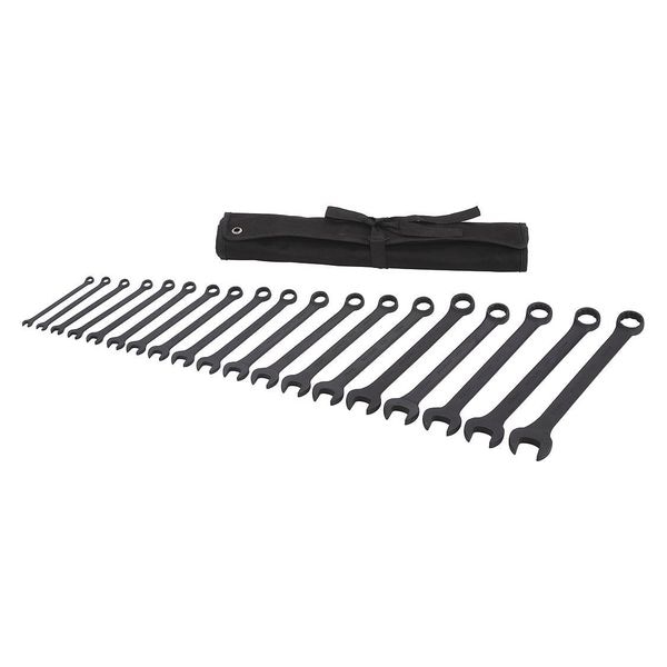 Combination Wrench Set, Alloy Steel, Black Oxide, Number of Tools 19, Range of Head Sizes 6 mm to 24 mm, Head Offset Angle 15 Degrees , Offset, Pouch, Metric, 6 mm, 7 mm, 8 mm, 9 mm, 10 mm, 11 mm, 12 mm, 13 mm, 14 mm, 15 mm, 16 mm, 17 mm, 18 mm, 19 mm, 20 mm, 21 mm, 22 mm, 23 mm, 24 mm, Rounded, Opening Angle (Deg.) 15 Degrees