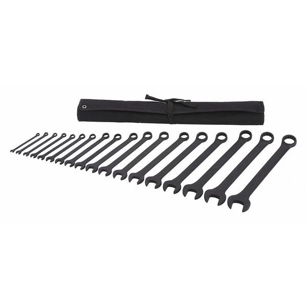 Combination Wrench Set, Alloy Steel, Black Oxide, Number of Tools 18, Range of Head Sizes 1/4 in to 1 1/4 in, Head Offset Angle 15 Degrees , Offset, Pouch, SAE, 1/4 in, 5/16 in, 11/32 in, 3/8 in, 7/16 in, 1/2 in, 9/16 in, 5/8 in, 11/16 in, 3/4 in, 13/16 in, 7/8 in, 15/16 in, 1 in, 1 1/16 in, 1 1/8 in, 1 3/16 in, 1 1/4 in, Rounded, Opening Angle (Deg.) 15 Degrees