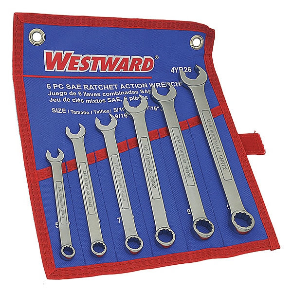 The Westward 4YR26 Combo Wrench Set is a durable set of ratcheting combination wrenches that can be used to complete a variety of tasks. This ratcheting open end wrench set contains 5/16 in., 3/8 in., 7/16 in., 1/2 in. and 9/16 in. sizes, as well as the corresponding 5/8 in. size for each head size. Each wrench has a 15-degree offset angle, so you will have more clearance when working on stubborn fasteners. The alloy steel material provides long-lasting durability and strength to keep your tools intact through countless jobs. With this Westward 4YR26 Combo Wrench Set, you can have everything you need for any repair or maintenance job on hand.