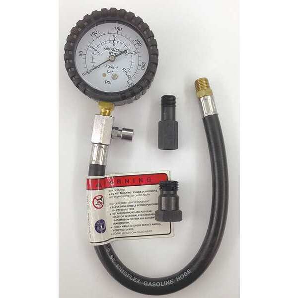 Compression Tester, Tool Type Compression Tester, Material Brass, Common Steel, Rubber Hose, Number of Pieces 3, Includes Compression Tester Gauge with 12 in Rubber Hose, 14mm Thread Spark Plug Adapter,18mm Thread Spark Plug Adapter