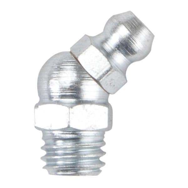 Grease Fitting, Grease Fitting Style Standard, Fitting Material Steel, Fitting Finish Zinc-Plated, Fitting Head Angle 45 Degrees , Fitting Thread Size M8-1.25mm, Fitting Thread Type Metric, Overall Length 7/8 in, Max. Pressure 5,000 psi, Meets/Exceeds DIN 71412, Package Quantity 10
