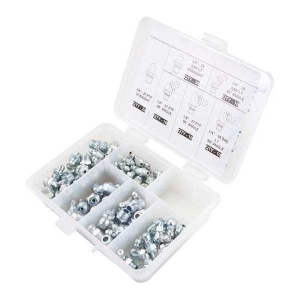 Grease Fitting Kit, Grease Fitting Style Standard, Fitting Material Steel, Dimension Type SAE, Thread Size 1/4 In.-28, 1/8 In.-27, Thread Type PTF, SAE-LT, Number of Pieces 100, Package Quantity 100
