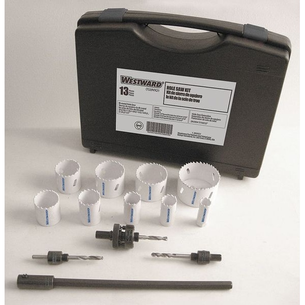 Hole Saw Kit, Materials Cut Metal, Plastics, Sheet Metal, Wood, Arbor Design Arbor Not Included, Tooth Material Bi-Metal, Teeth per Inch 4/6, Max. Cutting Depth 1 1/2 in, Impact Rated Not Impact Rated, Number of Hole Saws 9, Saw Size Range 3/4 in to 2 1/2 in, Hole Saw Sizes (Hole Saws) 3/4 in, 7/8 in, 1 1/8 in, 1 3/8 in, 1 1/2 in, 1 3/4 in, 2 in, 2 1/4 in, 2 1/2 in, Thread Size 1/2 In.-20, 5/8 In.-18, Shank Size 7/16 in, Pilot Drill Size 1/4 in dia x 4 in L, Number of Pieces 13