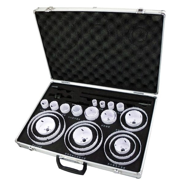 Hole Saw Kit, Primary Material Application Metal, Arbor Design Built-In Arbor, Tooth Material Bi-Metal, Teeth per Inch 4/6, Max. Cutting Depth 1 1/2 in, Impact Rated Not Impact Rated, Number of Hole Saws 24, Saw Size Range 3/4 in to 6 in, Hole Saw Sizes (Hole Saws) 3/4 in, 7/8 in, 1 in, 1 1/8 in, 1 1/4 in, 1 3/8 in, 1 1/2 in, 1 5/8 in, 1 3/4 in, 1 7/8 in, 2 in, 2 1/8 in, 2 1/4 in, 2 3/8 in, 2 1/2 in, 2 3/4 in, 3 in, 3 1/2 in, 4 in, 4 1/4 in, 4 1/2 in, 5 in, 5 1/2 in, 6 in
