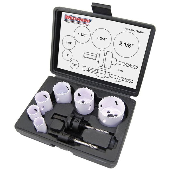 Hole Saw Kit, Primary Material Application Metal, Arbor Design Built-In Arbor, Tooth Material Bi-Metal, Teeth per Inch 4/6, Max. Cutting Depth 1 1/2 in, Impact Rated Not Impact Rated, Number of Hole Saws 6, Saw Size Range 7/8 in to 2 1/8 in, Hole Saw Sizes (Hole Saws) 7/8 in, 1 in, 1 1/4 in, 1 1/2 in, 1 3/4 in, 2 1/8 in, Thread Size 1/2 In.-20, 5/8 In.-18, Shank Size 1/4 in, 7/16 in, Pilot Drill Size 1/4 in dia x 3 in L, Number of Pieces 8