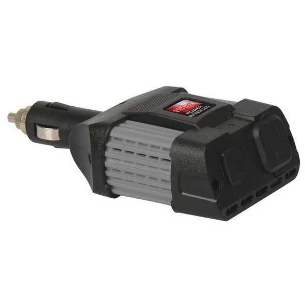 Inverter, Features Lightweight, Output Form Modified Sine Wave, DC Connection Cigarette Lighter Input, Continuous Output Power 100 W, Peak Output Power 200 W, Number of Outlets 1, Input Voltage 12V DC, Output Voltage 115V AC, Output Frequency 59 to 61 Hz, Efficiency 84 Percent, Overall Depth 1 1/2 in, Overall Height 5 3/8 in, Overall Width 2 3/4 in, Outlet Type Standard 3-Prong Outlet, Number of Standard USB Ports 1, Case Material ABS