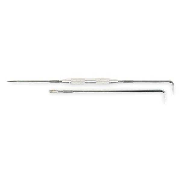 The Westward 4KY27 Machinist Scriber is a tool designed for marking metal. It features 2 straight and 1 90-degree tip, which makes it ideal for use on curved surfaces. The scriber has a 9 12 overall length and 5/16" handle diameter. The hardened steel tip ensures durability and longevity of the product. This scriber comes with a chrome plated finish, as well as a solid/knurled handle made of steel. With its hardy design, this Westward Scribers and Probes product will be the last one you need to buy for your project.