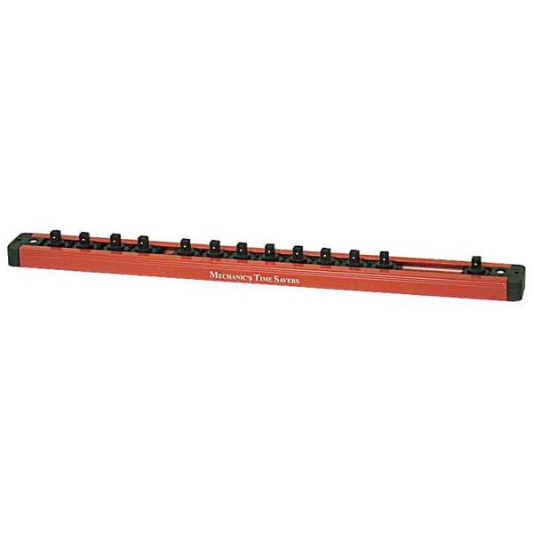 This Westward 5WXR4 Magnetic Socket Holder is the ideal tool for hanging your 1/4 in. sockets. The twist to lock design of this magnetic socket holder ensures that your tools stay secure and organized. It has a total width of 14 3/4 in., height of 1 in., length of 14 3/4 in. and depth of 1 3/8 in.. Made from aluminum, it comes with a red finish. This tool hangs securely on most metal surfaces, including walls, workbenches and toolboxes, thanks to its strong magnets. If you're looking for an easy way to store your tools, the Westward 5WXR4 Magnetic Socket Holder is just what you need.