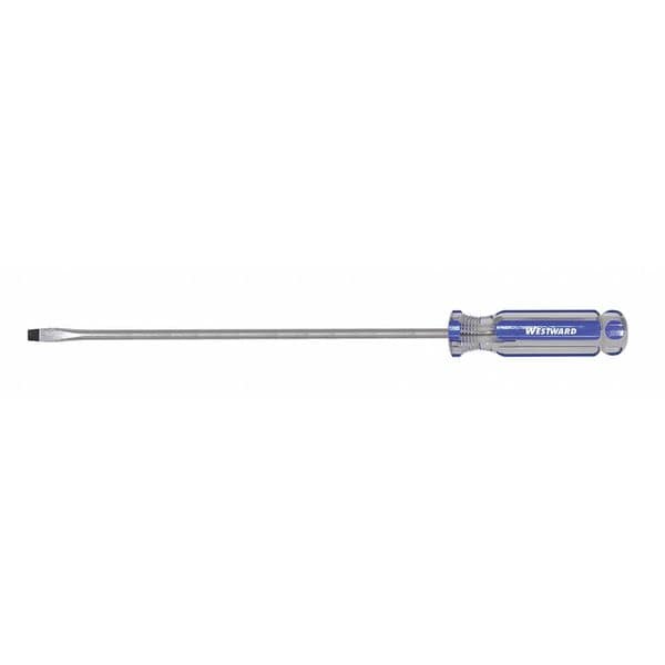The Westward 401M04 Screwdriver Slotted 1/8" 6 in Round is the perfect tool for fastening and loosening screws. It features a magnetic tip that helps to keep screws in place. The chrome plated blade, shank, and manganese phosphated tip give this screwdriver its sleek look. This magnetic slotted screwdriver has an overall length of 8 1/2 in., handle length of 2 1/4 in., and a 1/8" tip size. Its keystone slotted tip design is suitable for use on Phillips head screws as well as flathead screws. The alloy steel shank ensures durability while the fluted handle offers better grip. With its round shaft, sturdy construction, and magnetic tip, the Westward 401M04 Screwdriver Slotted 1/8" 6 in Round is sure to become your go-to tool for all jobs around the house or workplace.
