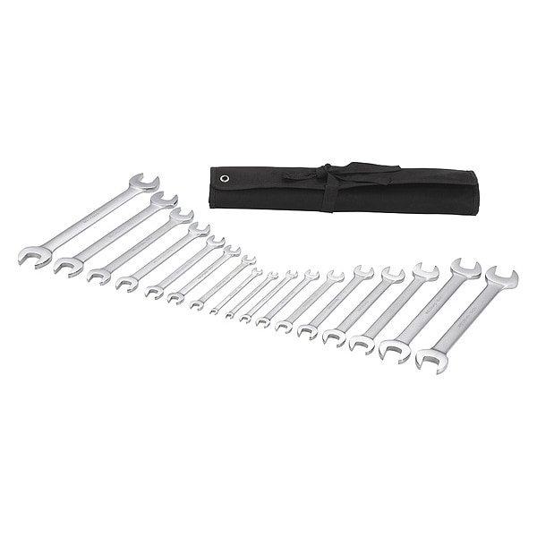 Open End Wrench Set, Alloy Steel, Satin, Number of Tools 17, 15 Degrees , Insulated No, Canvas Pouch, Double End, Rounded, One Piece, 5 in to 12 in