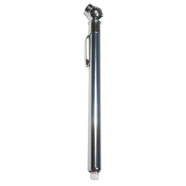 Pencil Tire Pressure Gauge, Product Type Tire Pressure Gauge, Gauge Type Pencil, Material Plastic, Steel, Overall Length 5 1/2 in, Tread Depth Calibration Increments Not Applicable, Tire Pressure Calibration Increments 1 psi, Minimum Operating Air Pressure 10 psi, Maximum Operating Air Pressure 75 psi, Includes Pocket Clip, Color Silver, Features 11 1/2 in Hose, Finish Chrome Plated, Maximum Operating Temperature 122 Degrees F, Maximum Rim Hole Size Not Applicable