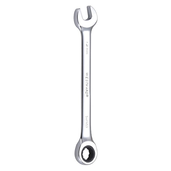 Ratcheting Wrench, Alloy Steel, Chrome, Head Size 13 mm, Overall Length 7 in, Head Offset Angle 0 Degrees , Opening Angle (Deg.) 15 Degrees , Standard, Head Thickness 5/16 in, Metric, Rounded