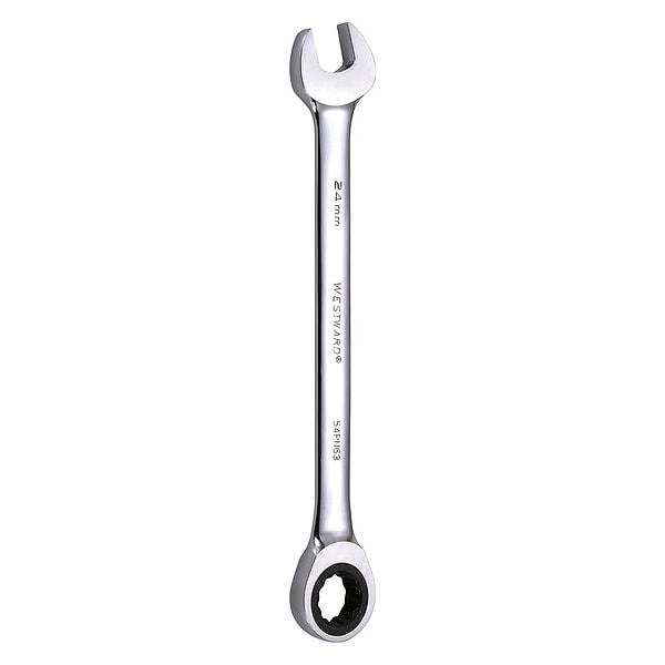 Ratcheting Wrench, Alloy Steel, Chrome, Head Size 24 mm, Overall Length 13 in, Head Offset Angle 0 Degrees , Opening Angle (Deg.) 15 Degrees , Standard, Head Thickness 9/16 in, Metric, Rounded