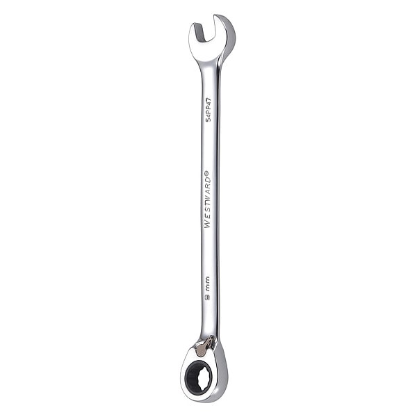 Ratcheting Wrench, Alloy Steel, Chrome, Head Size 9 mm, Overall Length 5 7/8 in, Head Offset Angle 15 Degrees , Opening Angle (Deg.) 15 Degrees , Offset, Head Thickness 1/4 in, Metric, Rounded