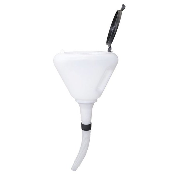 Spillproof Spout Funnel, Material Polyethylene, Fluid Capacity 57 fl oz, Overall Diameter 8 in, Overall Height 16 19/64 in, Spout Outside Diameter 45/64 in to 1 7/64 in, Spout Length 7 3/32 in, Color White, Spout Flexible Corrugated, Cover Yes, Includes Dust Cover, Flexible Spout, Wire Mesh Screen, Mouth Length 6 11/16 in, Mouth Shape Round, Spout Type Flexible