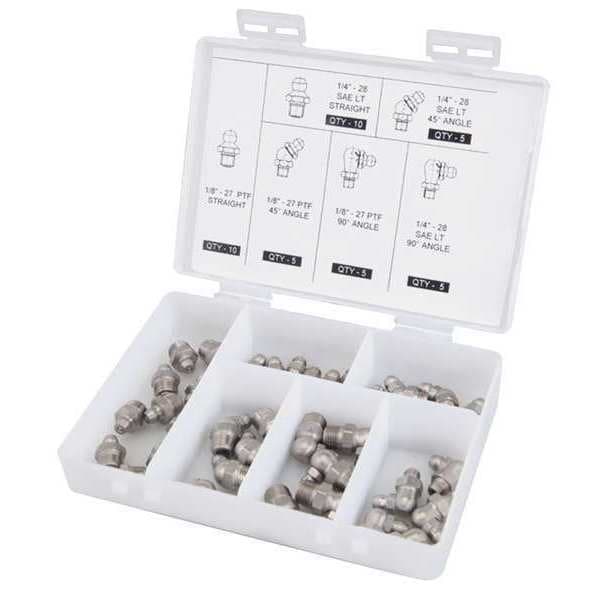 Grease Fitting Kit, Grease Fitting Style Standard, Fitting Material Stainless Steel, Dimension Type SAE, Thread Size 1/4 In.-28, 1/8 In.-27, Thread Type SAE-LT, Taper, Number of Pieces 40