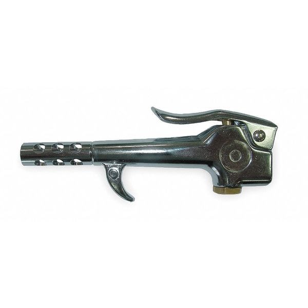 Air Gun, Air Gun Body Style Thumb Lever, Air Gun Inlet Size 1/4 in (F)NPT, 1 1/2 in Extension Size, Button Trigger, Output 90 psi, Max. Inlet Pressure 220 psi, 15 scfm Air Consumption, 1/8 In. (F)NPT Outlet Size, Nozzle Safety, 1 1/2 in Nozzle Length, Body Material Zinc Brass, Max. dBA 100, Color Chrome, Standards OSHA 1910.242(B), OSHA 1910.95
