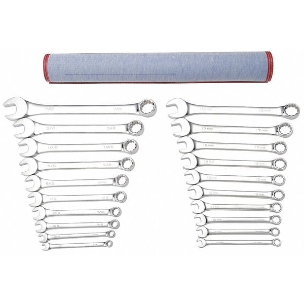 Combination Wrench Set, Alloy Steel, Chrome, Number of Tools 20, Range of Head Sizes 1/4 in to 7/8 in, 8 mm to 19 mm, Head Offset Angle 15 Degrees , Offset, Canvas Pouch, SAE/Metric, 1/4 in, 5/16 in, 8 mm, 9 mm, 3/8 in, 10 mm, 11 mm, 7/16 in, 12 mm, 1/2 in, 13 mm, 14 mm, 9/16 in, 15 mm, 5/8 in, 17 mm, 11/16 in, 19 mm, 3/4 in, 7/8 in, Rounded, Opening Angle (Deg.) 15 Degrees