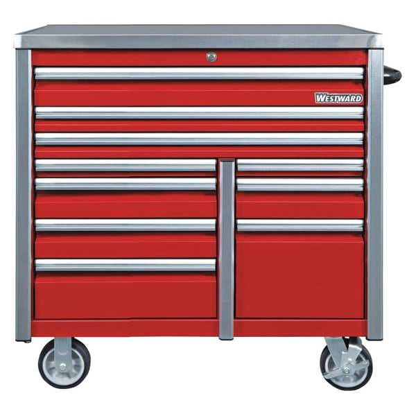WESTWARD Rolling Tool Cabinet, 10-Drawers, Matte Red, 42" W x 25.5" D x 49" H