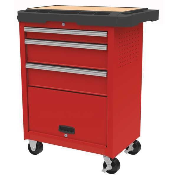 Rolling Tool Cabinet, Not Applicable Series, Standard Duty, Width 34 5/16 in, Depth 19 1/2 in, Height 39 5/16 in, Number of Drawers 3, Red, Drawer Color Red, Drawer Capacity 66 lb, Ball Bearing, Full Extension Drawer Slides, Powder Coated Finish, Storage Capacity 10,813 cu in, Load Rating 660 lb, Caster Size 4 in x 2 in, Number of Shelves 0, Steel, Body: 21, Drawer: 24 Gauge, Work Surface Material MDF, PP, Caster Wheel Material Polypropylene, Caster Type Rigid, Swivel, Keyed