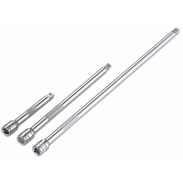 The WESTWARD - 54PR03 Socket Extension Set is a comprehensive toolset designed for use with 1/4" square drives. The set includes three pieces, each with different overall lengths of 3 in, 6 in, and 10 in respectively. This variety allows for flexibility and adaptability to suit various tasks. Each piece features an input drive size of 1/4 inch and an output drive size of the same measurement. The input drive shape is square as is the output drive shape, ensuring compatibility with corresponding tools.