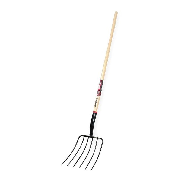 Manure Fork, Product Type Manure Fork, Blade Width Not Applicable, Head Style Not Applicable, Tine Material Steel, Number of Tines 6, Overall Width of Tines 12 in, Length of Tines 13 3/4 in, Handle Type Straight, Handle Material Wood, Handle Length 54 in, Head Material Steel, Overall Length 67 3/4 in, Features Forged Fork Head, Ferrule Length 9 in, Width of Tines 12 in, Tine Pattern Bent, Application Agriculture