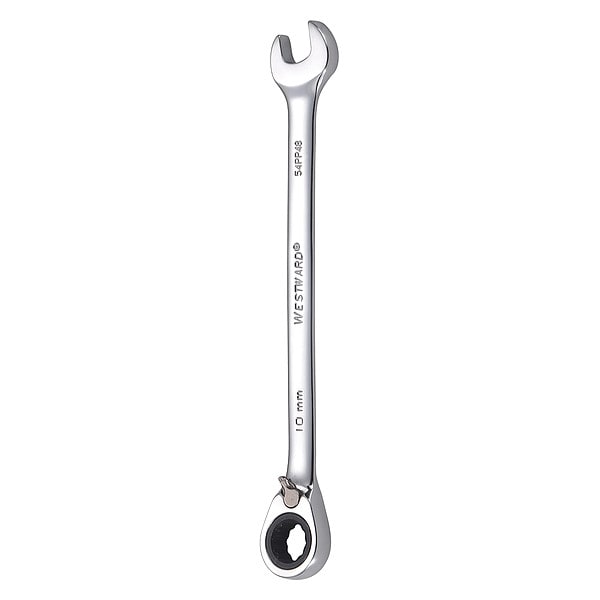 Ratcheting Wrench, Alloy Steel, Chrome, Head Size 10 mm, Overall Length 6 1/8 in, Head Offset Angle 15 Degrees , Opening Angle (Deg.) 15 Degrees , Offset, Head Thickness 5/16 in, Metric, Rounded
