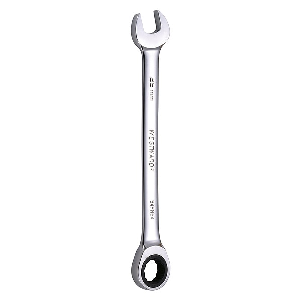 Ratcheting Wrench, Alloy Steel, Chrome, Head Size 25 mm, Overall Length 13 in, Head Offset Angle 0 Degrees , Standard, Head Thickness 9/16 in, Metric, Rounded