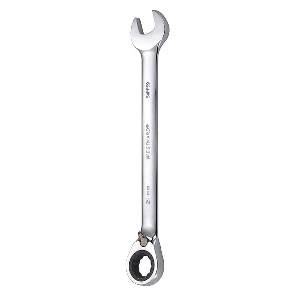 Ratcheting Wrench, Alloy Steel, Chrome, Head Size 21 mm, Overall Length 11 3/8 in, Head Offset Angle 15 Degrees , Opening Angle (Deg.) 15 Degrees , Offset, Head Thickness 1/2 in, Metric, Rounded