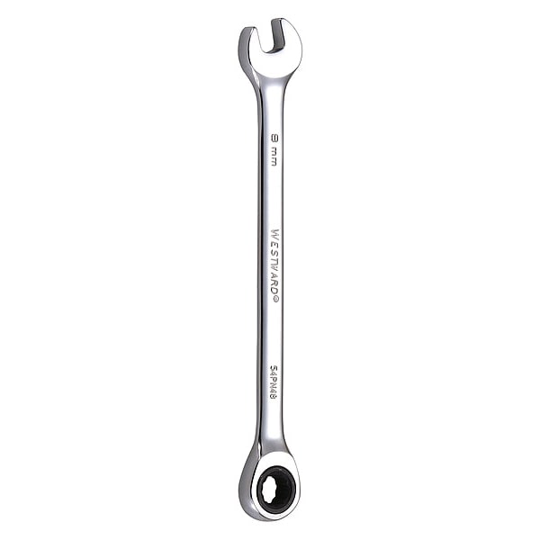 Ratcheting Wrench, Alloy Steel, Chrome, Head Size 8 mm, Overall Length 5 1/2 in, Head Offset Angle 0 Degrees , Opening Angle (Deg.) 15 Degrees , Standard, Head Thickness 1/4 in, Metric, Rounded