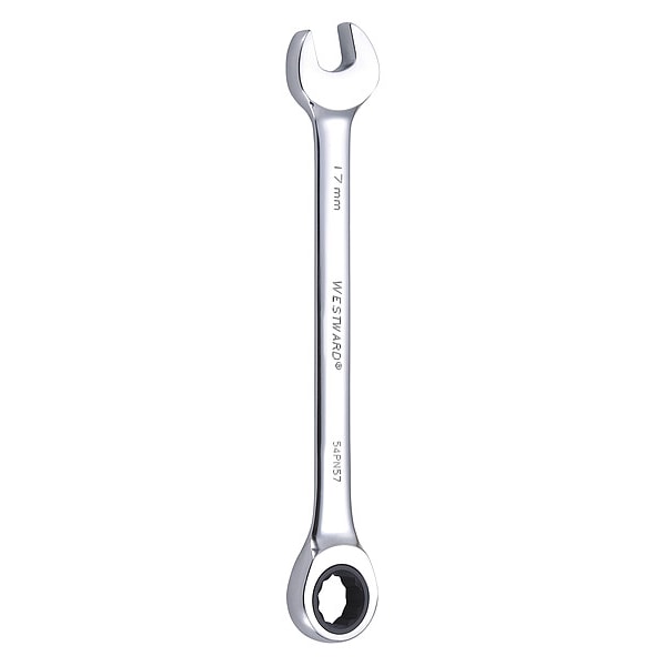 Ratcheting Wrench, Alloy Steel, Chrome, Head Size 17 mm, Overall Length 8 7/8 in, Head Offset Angle 0 Degrees , Opening Angle (Deg.) 15 Degrees , Standard, Head Thickness 7/16 in, Metric, Rounded